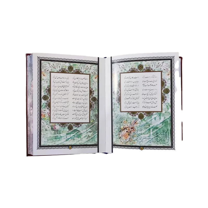 📖 متن کامل دیوان حافظ در ۵۸۴ صفحه به صورت تماممصور چاپ شده و روی کاغذ گلاسه براق و مرغوب قرار گرفته است؛ این ویژگی باعث میشود تصاویر، تذهیبها و طراحی صفحات با شفافیت و جذابیت خاصی نمایش داده شوند.