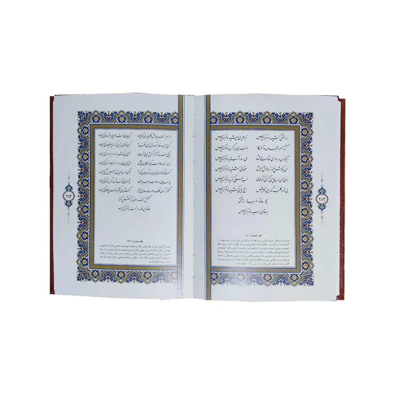 💎 این دیوان نفیس با اندازه جیبی (18.5 × 12.5 سانتیمتر) و وزن حدود 950 گرم، به راحتی قابل حمل است و در عین حال جلوهای چشمنواز دارد. قاب کشویی محکم از کتاب در برابر خطوخش و آسیب محافظت میکند و ماندگاری آن را تضمین میکند.