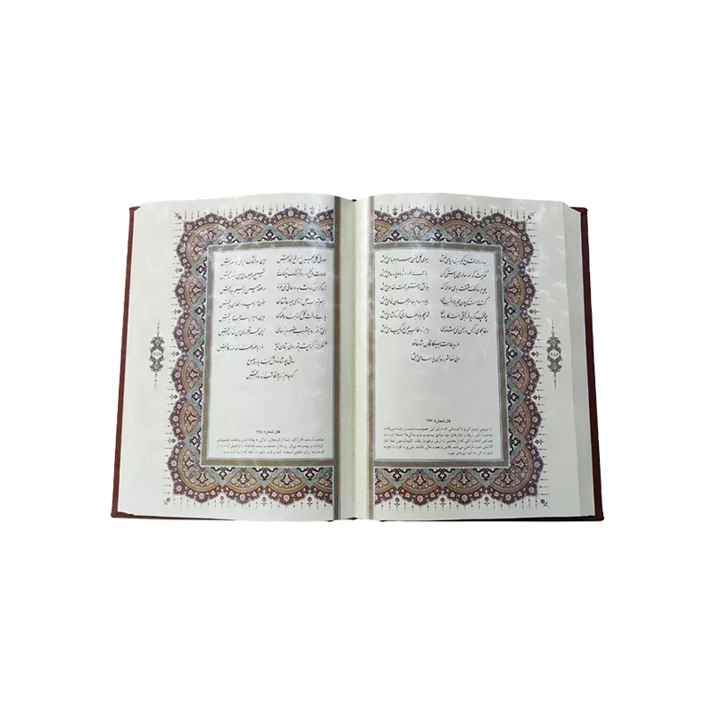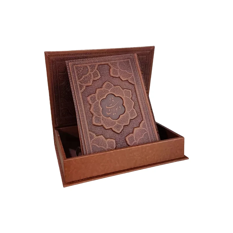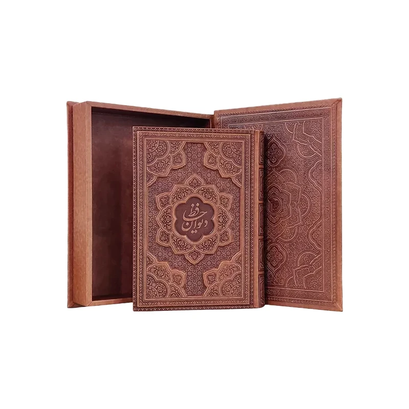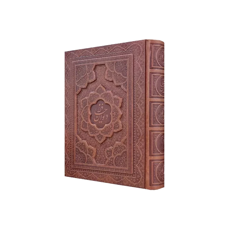 جلد این دیوان نفیس از چرم مرغوب ساخته شده و با تکنیک پیشرفته لیزری، نقوش سنتی و اسلیمی زیبا به صورت برجسته روی آن حک شده است. لمس این نقوش برجسته، حس ارتباط با هنر اصیل ایرانی را به شما منتقل میکند.