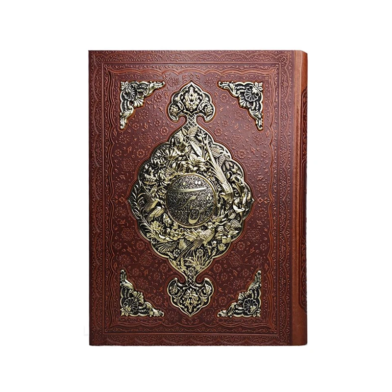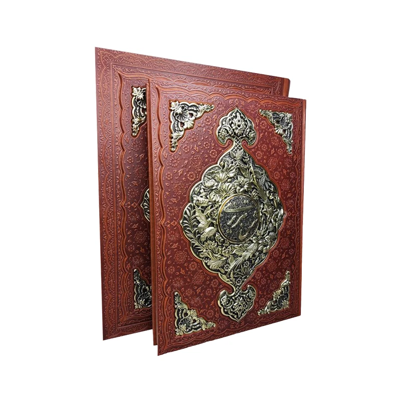 این نسخهی زیبا با قطع رحلی بزرگ (29 × 38 سانتیمتر) 📏 طراحی شده و ظاهری چشمگیر دارد که جلوهای ویژه به هر مجموعهی نفیسی میبخشد. جلد این کتاب از چرم مصنوعی برجسته (لیزری) 🪡 با طراحی لوکس و پلاک فلزی طرح مس 💫 ساخته شده است که جذابیت و دوام آن را دوچندان میکند. وجود قاب جعبه دار صندوقی 💼 علاوه بر محافظت کامل از کتاب، باعث شده این اثر به یک هدیهی بینظیر برای عزیزان و دوستان تبدیل شود.