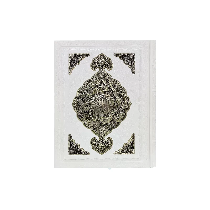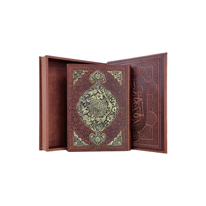 نسخهای فاخر از قرآن کریم با چاپ گلاسه براق و خوانا، جلد چرمی برجسته بهکمک حک لیزری، و جعبه صندوقی نفیس. پلاک فلزی طرح مس بر روی جلد، جلوهای اصیل و مجلسی ایجاد کرده و این اثر را به انتخابی عالی برای هدیههای مذهبی، وقف و کلکسیونداران کتابهای نفیس تبدیل میکند.